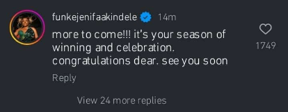 Taking to her comment section, Funke congratulated her as she declared that this is Priscilla’s season of winning and celebration.