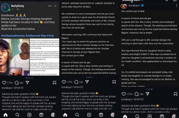 Giving an update on Wednesday via her Instagram page, Biola said Adeola has been spotted in Mali, but she has yet to speak to her mother. Bayo said Adeola hasn’t been picking up her calls, which has left them worried.