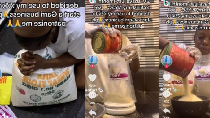 She said; “POV: I just have 1 month left to finish my NYSC, so I decided to use my 77k to start garri business. Please patronise me. Way maker pls make a way for me in the dis business. patronize me plsssss.”