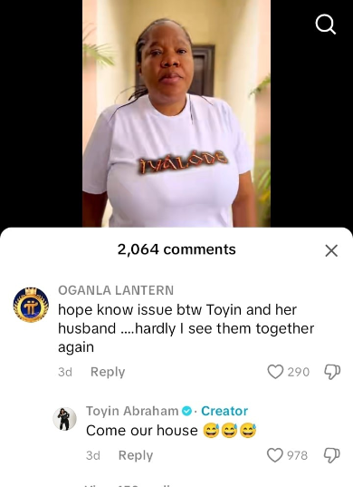 A fan identified as Oganla Lantern stirred conversation after questioning the current state of things between Nollywood actress Toyin Abraham and her husband, actor Kolawole Ajeyemi.