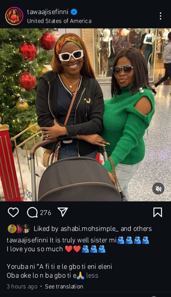 Taking to her Instagram page, Tawa shared a heartfelt message along with a photo of herself and Biola, affirming her affection and standing by her during this difficult time.