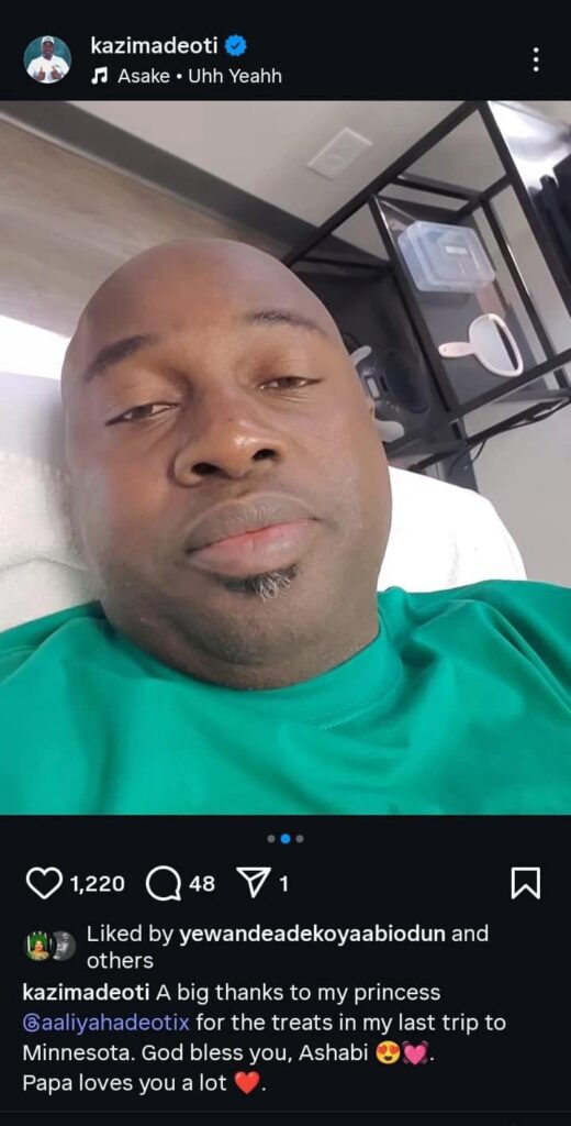 Nigerian filmmaker Kazim Adeoti, husband of actress Mercy Aigbe, has expressed heartfelt appreciation to his daughter from his first wife after she treated him to a special experience in Minnesota.