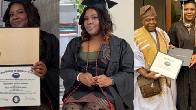 Popular US-based actress Oyinkansola Elebuibon has been receiving a flood of congratulatory messages as she celebrates earning her master’s degree from the American College of Health Sciences.