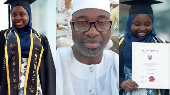 Nollywood actress Mercy Aigbe’s husband, Kazim Adeoti, has expressed heartfelt appreciation for his daughter, Hauwa, who recently graduated from nursing school.