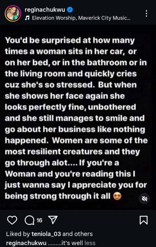 In a post on her Instagram page, she reflected on how women often endure emotional pain in silence—crying in their cars, on their beds, or even in the bathroom—yet still manage to compose themselves, put on a smile, and go about their day as though nothing happened.