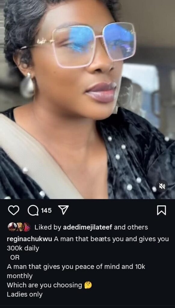 Taking to her Instagram page, she asked if they would prefer a boyfriend who physically abuses them but gives them ₦300,000 daily, or one who provides peace of mind but offers only ₦10,000 monthly.