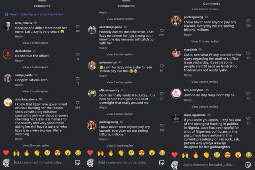 One Kes_luxuryhub wrote, “Justice no dey Naija normally nahttps://googleads.g.doubleclick.net/pagead/ads?gdpr=0&us_privacy=1—&gpp_sid=-1&client=ca-pub-7567929817198583&output=html&h=390&adk=897389536&adf=3145331525&pi=t.aa~a.3021498529~i.6~rp.1&w=390&abgtt=6&lmt=1752135354&num_ads=1&rafmt=1&armr=3&sem=mc&pwprc=5625259163&ad_type=text_image&format=390×390&url=https%3A%2F%2Fwww.gossipinfo.ng%2Ffans-reactions-as-court-allegedly-dismisses-iyabo-ojos-lawsuit-against-lizzy-anjorin%2F&fwr=1&pra=3&rh=292&rw=350&rpe=1&resp_fmts=3&sfro=1&wgl=1&fa=27&dt=1752135354990&bpp=4&bdt=1443&idt=4&shv=r20250702&mjsv=m202507070101&ptt=9&saldr=aa&abxe=1&cookie=ID%3Da2fb099a77453c26%3AT%3D1750539629%3ART%3D1752135350%3AS%3DALNI_Mbql9txtce8hT3WpxuOeeOXz-HUEw&gpic=UID%3D00001155fd1e4a3b%3AT%3D1750539629%3ART%3D1752135350%3AS%3DALNI_Mb137D0znGOBts-OfpSLmX2ubHM5Q&eo_id_str=ID%3Ddd6a51bc22432e9d%3AT%3D1750539629%3ART%3D1752135350%3AS%3DAA-AfjbiSklgAjuB7za2p_r2q-rV&prev_fmts=0x0%2C390x390&nras=3&correlator=1430229586721&frm=20&pv=1&u_tz=60&u_his=100&u_h=844&u_w=390&u_ah=844&u_aw=390&u_cd=24&u_sd=3&adx=0&ady=2967&biw=390&bih=665&scr_x=0&scr_y=0&eid=95345038%2C95353386%2C95362656%2C95364947%2C95365235%2C95365385%2C95365461%2C95365698%2C31093335%2C95359266%2C95365798&oid=2&pvsid=5819647411653247&tmod=1401871265&uas=1&nvt=1&ref=https%3A%2F%2Fwww.gossipinfo.ng%2Fcategory%2Ftie-celebrities%2F&fc=1408&brdim=0%2C0%2C0%2C0%2C390%2C0%2C390%2C844%2C390%2C665&vis=1&rsz=%7C%7Cs%7C&abl=NS&fu=128&bc=31&bz=1&psd=W251bGwsbnVsbCxudWxsLDNd&pgls=CAEaBTYuOC4x~CAEQBRoGMy4zMC4y&ifi=3&uci=a!3&btvi=1&fsb=1&dtd=9