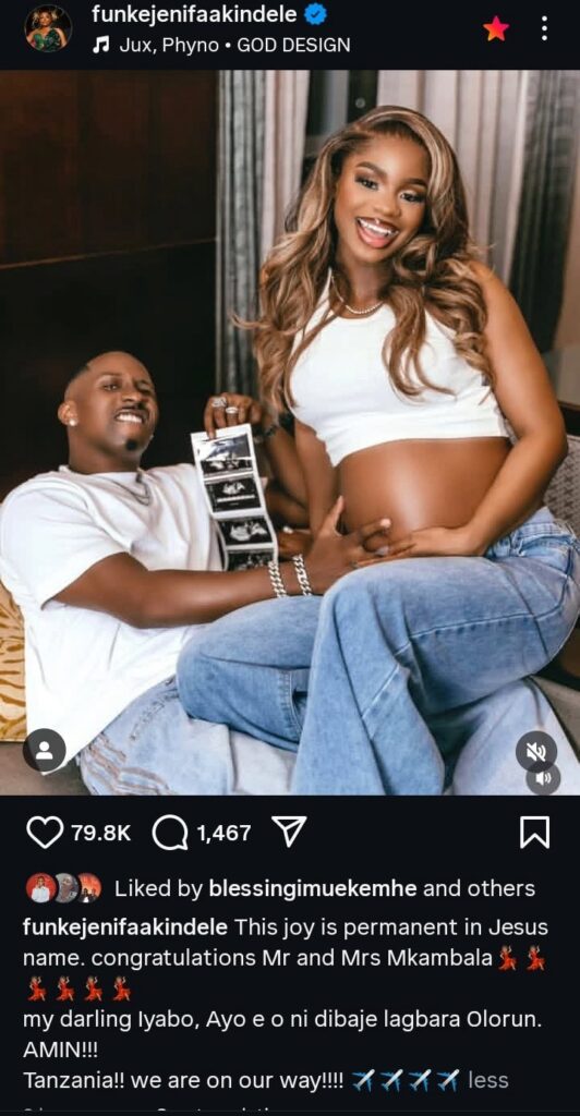 In an Instagram post, Funke prayed that their joy shall be permanent as she congratulated the soon-to-be parents.