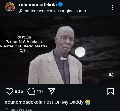 Popular Nollywood actor Odunlade Adekola is currently mourning the loss of his beloved father, Pastor N.A. Adekola.